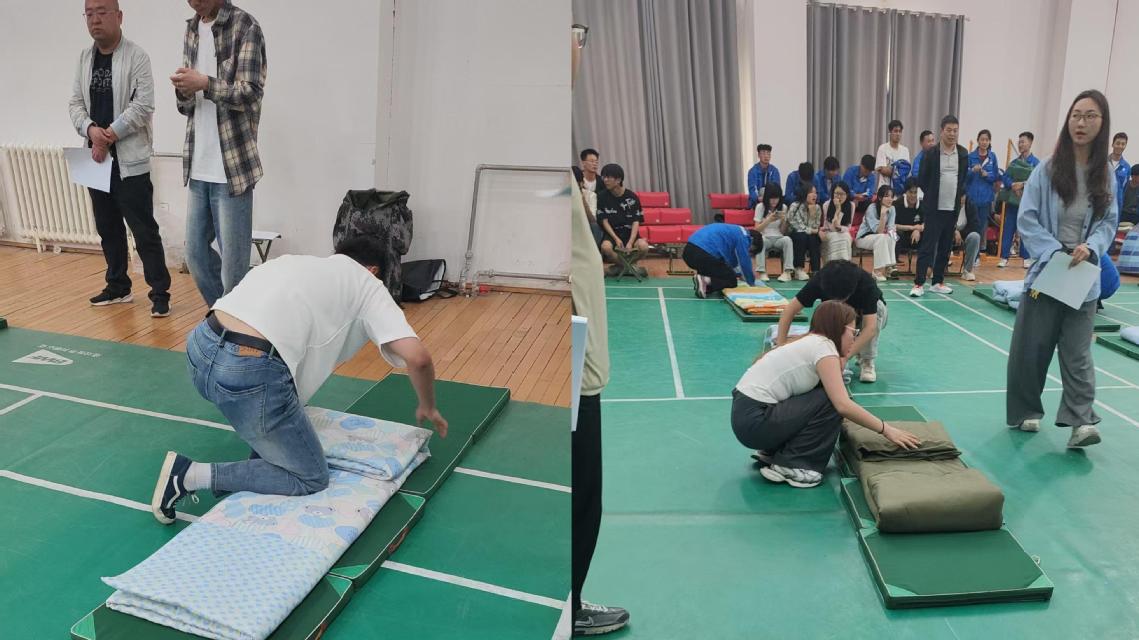 “块乐生活”叠军被大赛现场气氛热烈,充满竞技与趣味。活动前期,公司邀请退伍员工开展“叠军被技巧培训课”,通过现场示范、手把手教学,向同学们传授叠军被的要领,从铺平被子、折叠边角到压出棱角,每一个步骤都进行了细致讲解。